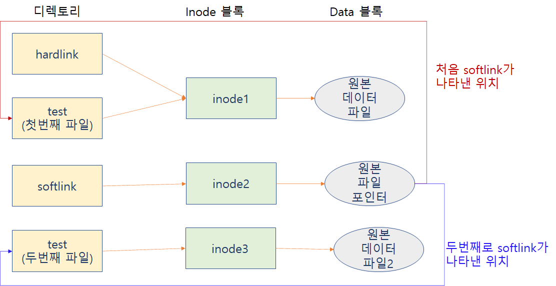 hardlink와 test의 inode 블록번호는 동일하고 softlink만 다른것을 확인할 수 있다.